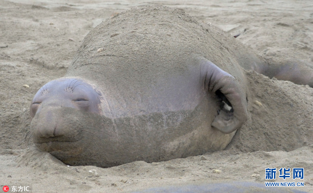 2017年7月13日报道(具体拍摄时间不详),美国摄影师William Drumm在圣西蒙旅游时邂逅一只在沙土里挠痒痒的象海豹,它舒舒服服地趴在地上,身上盖着沙土,两只蹼则在身侧来去抓痒痒,一脸舒适享受。William表示,5月和8月是母象海豹蜕皮的季节,每当这个时候,它们全身的皮肤和毛发都会褪掉一层。图片来源:东方IC