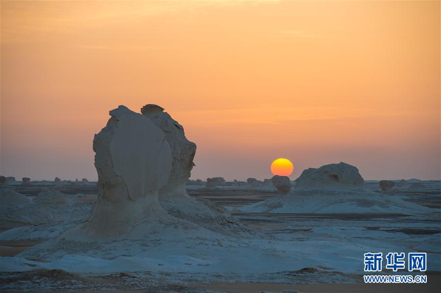 这是9月26日在埃及吉萨省西部沙漠中拍摄的“白沙漠”日出景色。