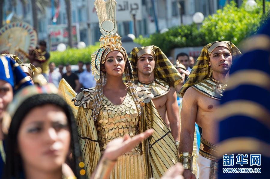 9月30日,在埃及亚历山大市,一名演员(中)饰演“埃及艳后”克莱奥帕特拉七世参加主题活动。当日,一场主题为“‘埃及艳后’克莱奥帕特拉七世之梦”的活动在埃及亚历山大市举办。该活动旨在引起人们对克莱奥帕特拉七世沉没的水下宫殿的关注,并促进该市旅游业的发展。新华社记者孟涛摄