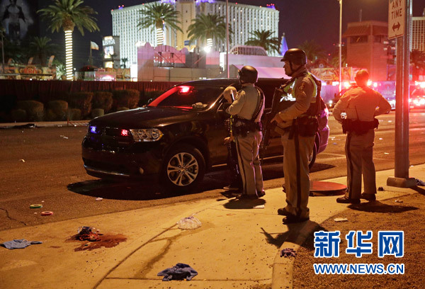 10月2日,在美国西部城市拉斯维加斯,警察在枪击事件现场警戒。新华社/美联
