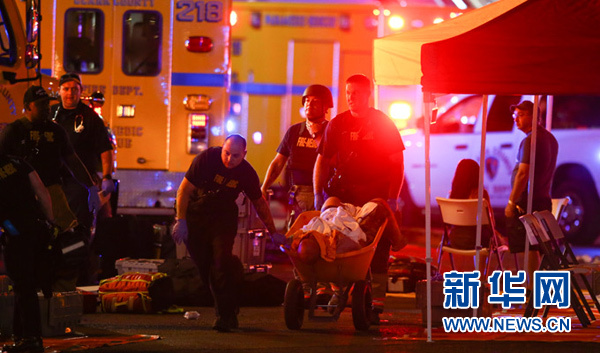 10月1日,在美国西部城市拉斯维加斯,工作人员在枪击事件现场救治伤者。新华社/美联
