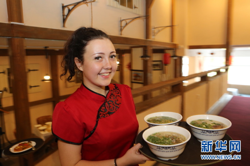 试营业期间餐厅服务员为客人端来餐厅主打的牛肉面。新华网记者魏忠杰摄