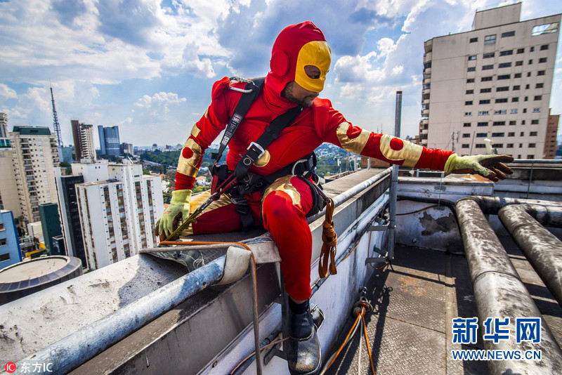 当地时间2017年10月12日,巴西圣保罗,两名窗户清洗工人扮成超人,在半空中与Sabara儿童医院的患儿互动,画面十分暖心。10月12日是巴西儿童节。 (图片来源:东方IC)