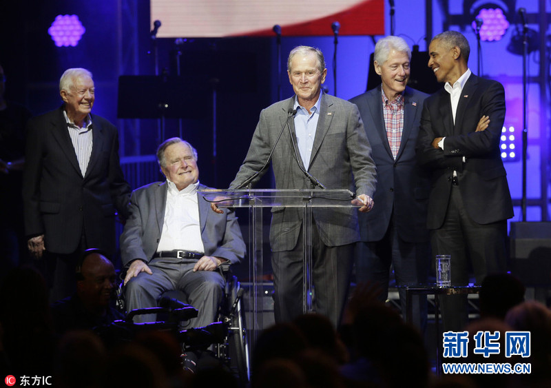 当地时间2017年10月21日,美国德克萨斯州大学城,美国5位前总统——吉米·卡特、老布什、小布什、克林顿和奥巴马21日晚出席德州大学城的音乐会,为救济德克萨斯、佛罗里达、波多黎各和美属维尔京群岛的遭受飓风袭击的灾民筹款。美国现任总统特朗普录制视频,在音乐会上播放。(图片来源:东方IC)