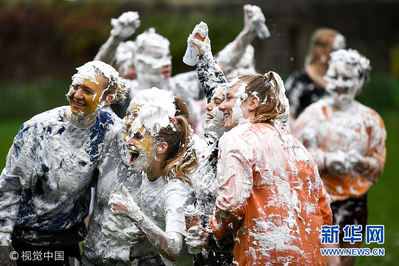 当地时间2017年10月23日,英国圣安德鲁斯,苏格兰圣安德鲁斯大学的学生们沉浸在传统节日中,他们全身抹上泡沫,庆祝“学院家庭日”。每年11月学校的学生都会举行“周末葡萄干节”,大学新生要向高年级学生赠送葡萄干(现在是泡沫)作为礼物,以此感谢学长对他们的指导,作为交换,新生会收到一张用拉丁文书写的“收据”。(图片来源:视觉中国)
