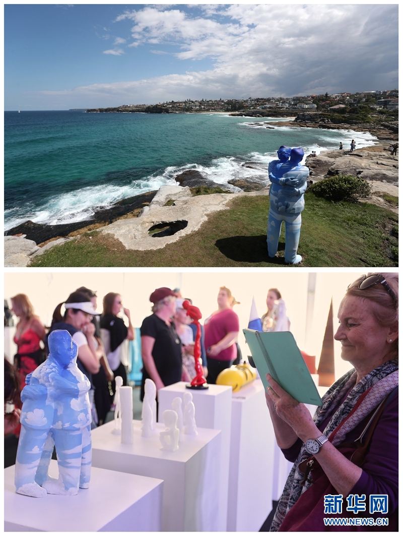 海滩。上图为游客在雕塑旁拍照;下图为室内展出的雕塑模型(拼版照片)。新华网记者白雪飞摄