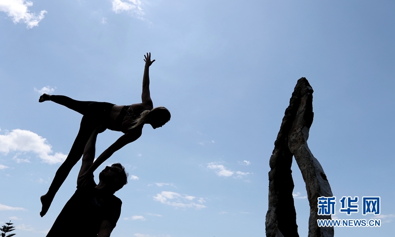 海滩。两位健身爱好者在在艺术家彼得·伦德伯格设计的雕塑作品旁运动。新华网记者白雪飞摄