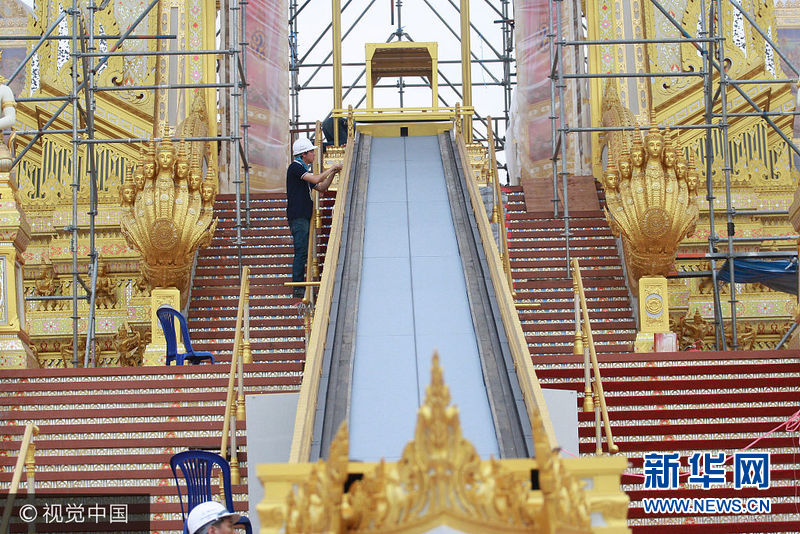 2017年10月12日,泰国已故国王普密蓬火葬场地准备工作进行中。泰国内阁会议确认第九世王普密蓬火葬皇家仪式在2017年10月25-29日举行,整个葬礼将持续5天,26日(星期四)将是火化升天正日,特别放假一天,方便民众参与普密蓬国王的最后告别仪式。泰国国王拉玛九世普密蓬于去年10月13日去世,88岁的普密蓬在位70年,是世界上在位时间最长的君主,广受泰国人民爱戴,在一年的国丧期内不仅有大量的哀悼仪式,许多人选择常年穿黑色或白色的衣服自愿为他守丧。(图片来源:视觉中国)