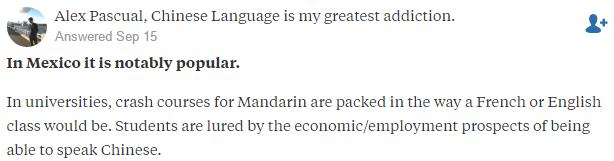 网友Alex Pascual说,在墨西哥,汉语也非常受欢迎。墨西哥大学里的汉语速成课程与法语和英语课程并驾齐驱。能说中文的学生们将获得更广阔的就业前景。