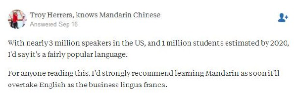 休斯顿的网友Troy Herrera说,美国有将近300万说汉语的人,到2020年,估计还会有100万人。所以,汉语是流行的语言。“我强烈建议大家学习汉语,因为作为商业语言,它的重要性可能超越英语。”
