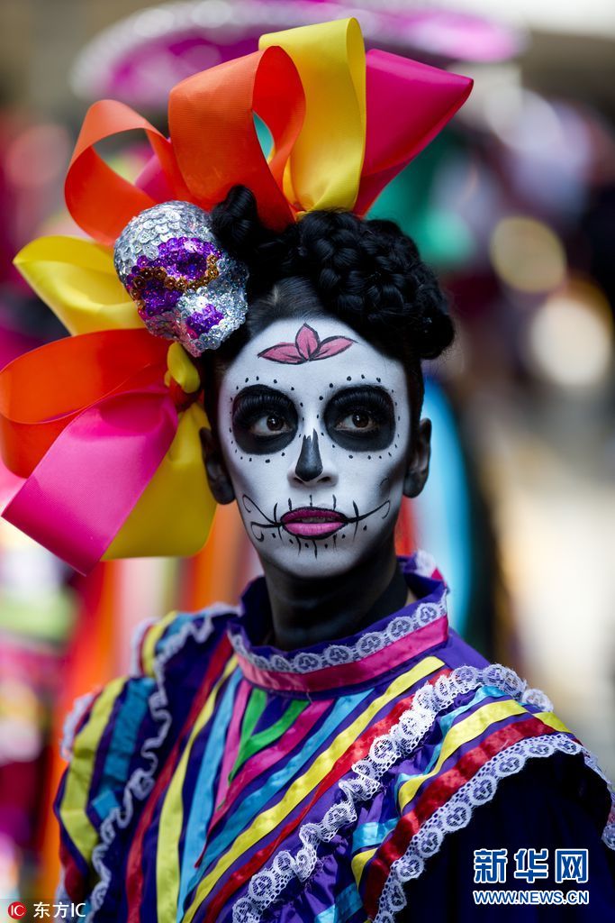 当地时间2017年10月28日,墨西哥墨西哥城,民众恐怖装扮,盛装参加游行,庆祝亡灵节。(图片来源:东方IC)