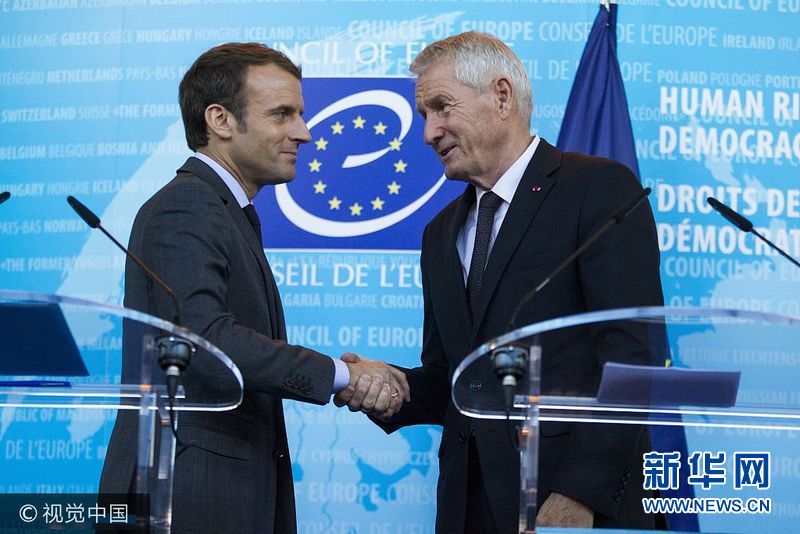 当地时间2017年10月31日,法国斯特拉斯堡,法国总统马克龙与欧洲委员会秘书长托尔比约恩·亚格兰召开联合新闻发布会。(图片来源:视觉中国)