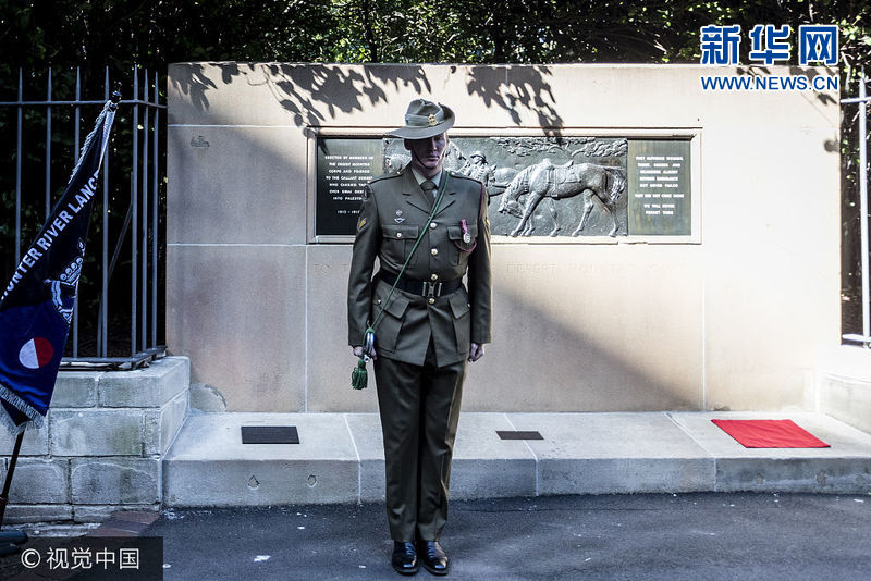 当地时间2017年10月31日,澳大利亚悉尼,民众、警察以及退伍军人代表聚集在当地举行纪念活动,纪念骑兵团与奥斯曼帝国战役100周年。1917年10月31日,近千名英国、澳大利亚和新西兰士兵战胜奥斯曼帝国军队。(图片来源:视觉中国)