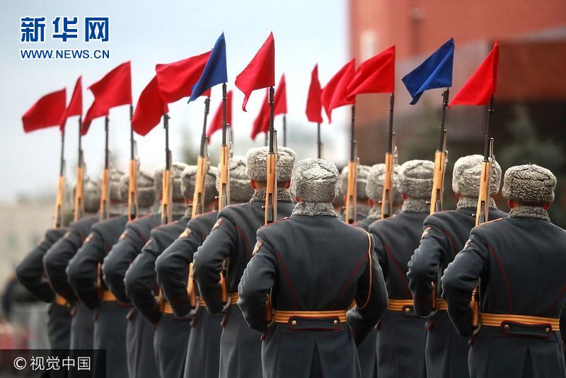 当地时间2017年11月5日,俄罗斯莫斯科,俄罗斯军人参加阅兵彩排,纪念1941年苏联士兵奔赴前线在红场的大阅兵。1941年11月7日,苏联莫斯科红场举行了声势浩大的阅兵式。数十万红军官兵走过主席台接受斯大林等苏联党政领导人的检阅。之后,奔赴西部前线抗击法西斯德国军队的入侵。(图片来源:视觉中国)