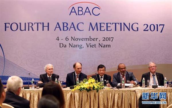 11月6日,在越南岘港,APEC工商咨询理事会成员代表出席记者会。2017亚太经合组织(APEC)工商咨询理事会成员6日表示,中国经济发展对APEC区域经济发展至关重要,期待中国智慧在推动区域经济一体化方面发挥更大作用。新华社记者李鹏摄