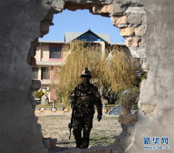 11月7日,在阿富汗首都喀布尔,安全人员在遇袭的电视台附近警戒。阿富汗媒体7日证实,阿富汗沙姆沙德电视台位于首都喀布尔市区的办公地点当天遭武装分子袭击,已造成包括一名女性在内的至少2人死亡,另有20人受伤。新华社发(拉赫马特·阿里扎达摄)