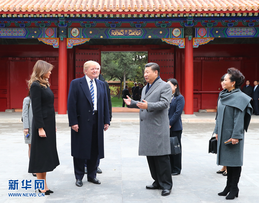 11月8日下午,国家主席习近平和夫人彭丽媛在北京故宫博物院迎接来华进行国事访问的美国总统特朗普和夫人梅拉尼娅。两国元首夫妇在宝蕴楼简短茶叙。新华社记者 谢环驰 摄