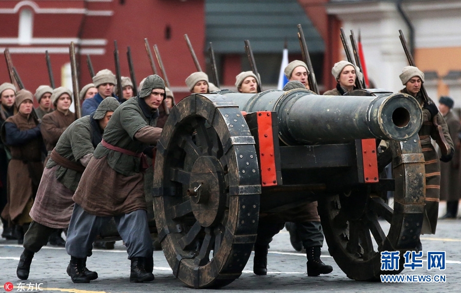 当地时间2017年11月7日,俄罗斯莫斯科,俄罗斯士兵身着二战时期服装,参加大阅兵,纪念1941年红场阅兵76周年。(图片来源:东方IC)