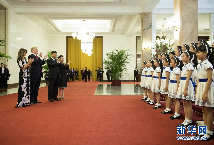 11月9日,国家主席习近平在北京人民大会堂东门外广场举行欢迎仪式,欢迎美利坚合众国总统唐纳德·特朗普对中国进行国事访问。这是习近平和夫人彭丽媛同特朗普夫妇在人民大会堂欣赏文艺表演。新华社记者 李学仁 摄