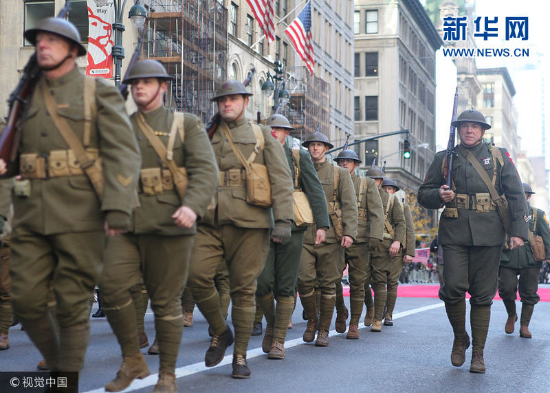当地时间2017年11月11日,美国纽约举行退伍军人节大游行。当天,约4万名退伍军人、现役军人、军人家属和高中学生等组成方队参加一年一度的退伍军人节大游行,向历次战争的退伍军人表达敬意。图为参加游行的方队沿曼哈顿第五大道行进。(图片来源:视觉中国)