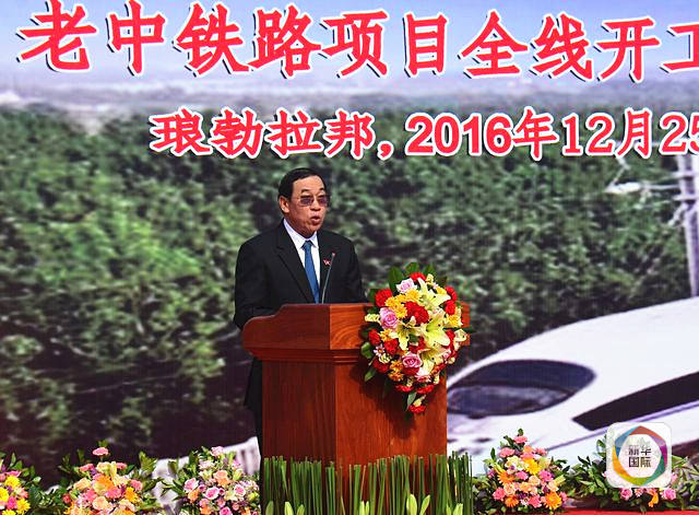 2016年12月25日,老中铁路项目全线开工仪式在老挝琅勃拉邦举行,老挝公共工程与运输部部长奔占·辛塔冯在开工仪式上致辞。(新华社发)