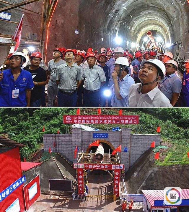 接片:上图,10月12日,老中铁路有限公司组织由200多人组成的大型观摩团,观摩中老铁路努瓦山隧道施工;下图,老挝乌多姆赛省孟赛县中老铁路努瓦山隧道外景。(新华社发)