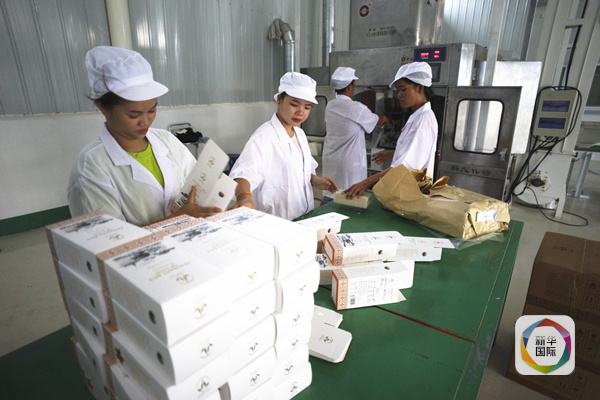 工人正在中资企业炫烨(老挝)有限公司的生产车间内包装老挝大米。(新华社记者凌朔摄)