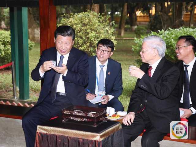 在胡志明故居,习近平总书记、国家主席同阮富仲总书记品茗畅谈,承诺不忘中越传统友谊的“初心”。