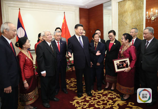在万象,习近平同奔舍那等家族友人亲切见面、再叙友情,勉励他们继续投身中老友好事业。