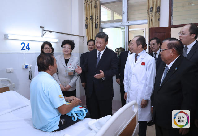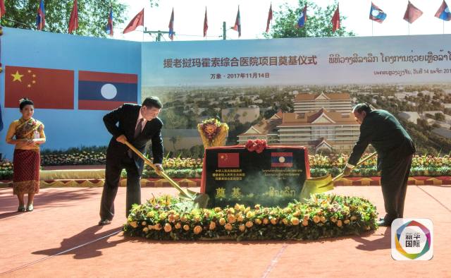 在万象,习近平同老挝人民革命党中央委员会总书记、国家主席本扬一道出席中国为老挝援建的民生领域标志性项目玛霍索综合医院奠基仪式。