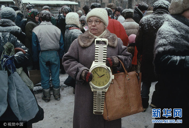 1991年,穿着带皮大衣、戴着白色毛线帽子的妇人站在街边兜售挂钟。(图片来源:视觉中国)