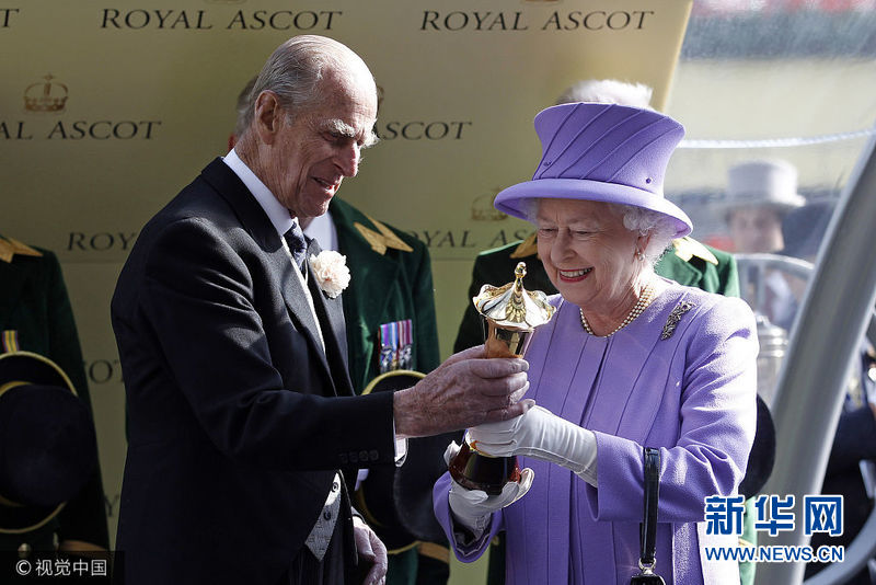 当地时间2012年6月22日,英国皇家爱斯科赛马会举行,女王伊丽莎白二世的爱驹Estimate赢得女王花瓶,女王从丈夫菲利普亲王手中接过奖杯。(图片来源:视觉中国)
