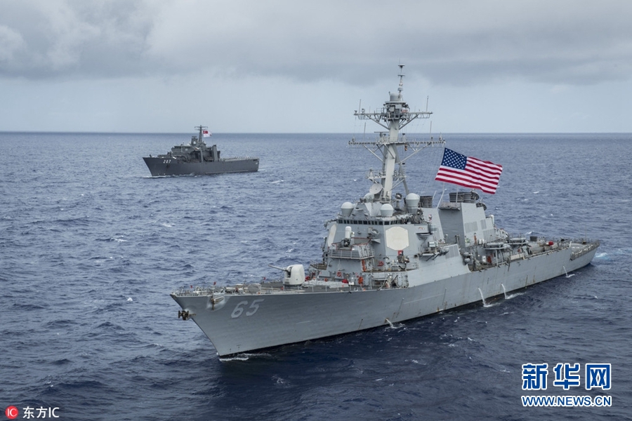 资料图:当地时间2017年8月28日,美军第七舰队阿利伯克级导弹驱逐舰“本福尔德”号(右)在关岛海岸参加演习。当地时间2017年11月18日,美军第七舰队阿利伯克级导弹驱逐舰“本福尔德”号在日本相模湾进行演习期间,与一艘日本商用拖船相撞。据俄罗斯卫星网报道,美海军第七舰队发声明称,此次撞船事件中无人受伤,“本福尔德”号轻微受损,动力系统仍可运作,但须进行全面定损。至于日本拖船,则要由另一艘船,拖往横须贺港。这是美军第七舰队在今年发生的第5起撞船事故,前4次共造成17名海军官兵死亡,两艘军舰严重受损,回厂修理,损失十数亿美元。(图片来源:东方IC)