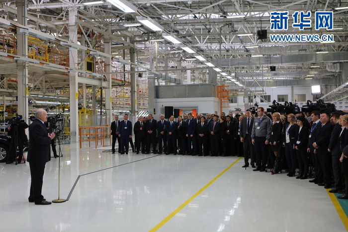 白俄罗斯总统卢卡申科在新落成的白俄罗斯吉利乘用车制造厂与工人们进行现场交流。记者魏忠杰 摄