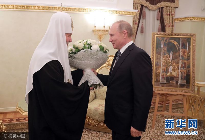 当地时间2017年11月20日,俄罗斯莫斯科,莫斯科及全俄罗斯东正教大牧首基里尔一世过生日,总统普京向其赠送鲜花和画作祝贺。(图片来源:视觉中国)