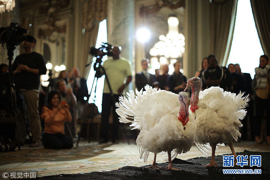 当地时间2017年11月20日,美国华盛顿,国家感恩节火鸡Drumstick 和Wishbone在国家火鸡联盟举办的活动中向媒体展示。其中一只40磅重的火鸡将于21日送往白宫,特朗普将举行隆重的“赦免”火鸡仪式。之后这两只20周大的火鸡都将定居新家。(图片来源:视觉中国)