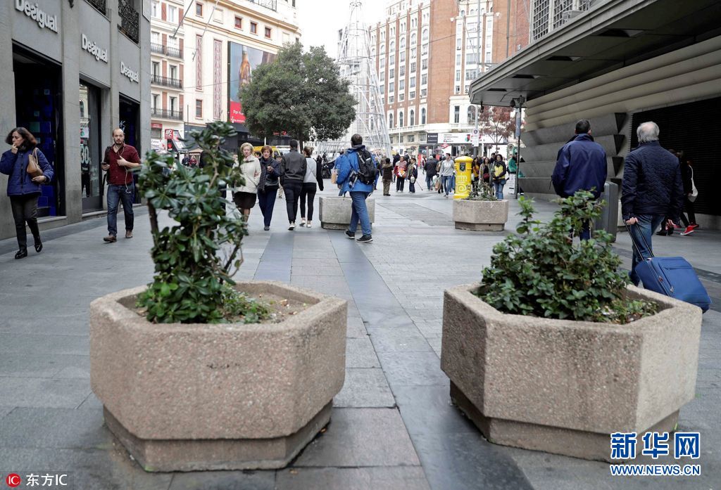 当地时间2017年11月24日,西班牙马德里,为确保圣诞期间的安保工作顺利进行,当地在闹市街道设置花坛路障。(图片来源:东方IC)