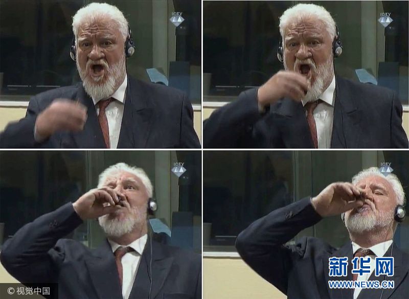 11月29日,波黑战争罪被告洛博丹.普拉亚克(Slobodan Praljak)在荷兰海牙的国际刑事法庭上服毒后死亡。在他吞服不明液体前,法官刚刚宣布判处他20年监禁。目前,荷兰警方宣布法庭为犯罪现场。 (图片来源:视觉中国)