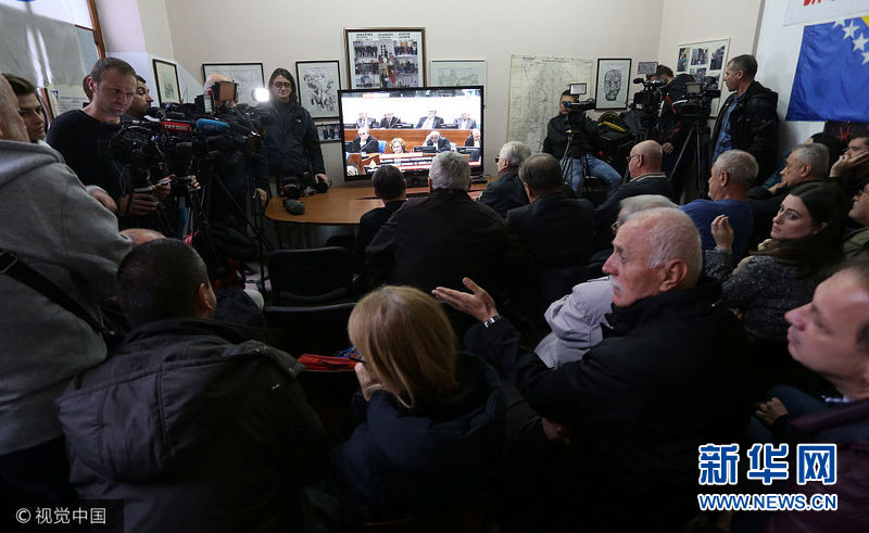 11月29日,波黑莫斯塔,民众观看审判。波黑战争罪被告洛博丹.普拉亚克(Slobodan Praljak)在荷兰海牙的国际刑事法庭上服毒后死亡。在他吞服不明液体前,法官刚刚宣布判处他20年监禁。目前,荷兰警方宣布法庭为犯罪现场。(图片来源:视觉中国)