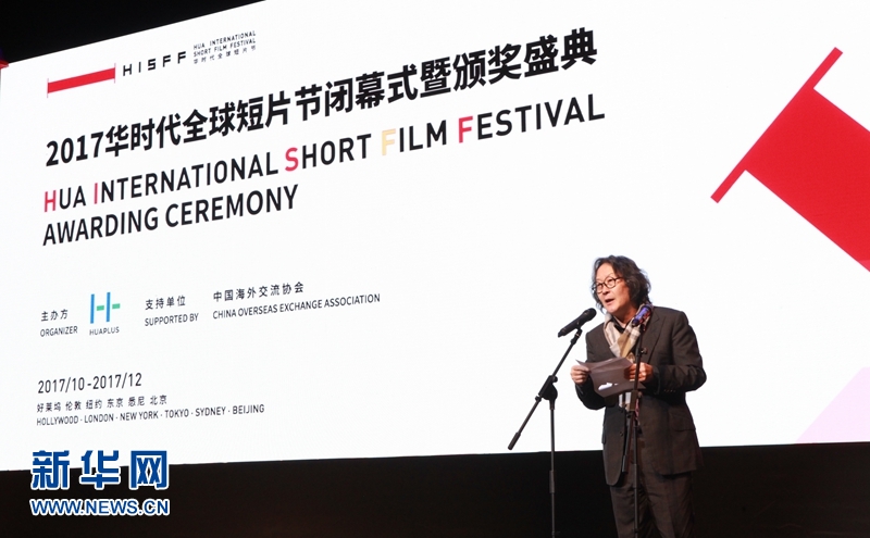 12月3日,华时代全球短片节艺术顾问、知名艺术家徐冰致辞。当日,2017华时代全球短片节闭幕式暨颁奖典礼在北京天桥艺术中心举行。新华网发 巩阳摄