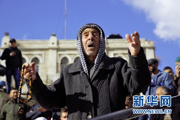 在耶路撒冷老城大马士革门附近抗议活动中,一名巴勒斯坦老人在呐喊。记者陈文仙 摄