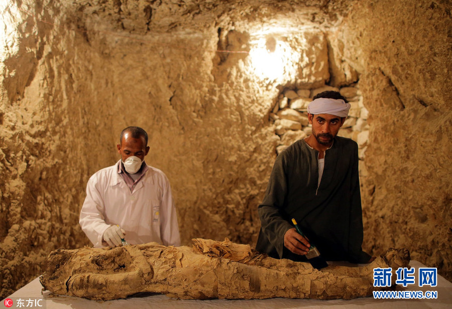埃及考古人员发现新墓穴 出土一具木乃伊及多种古文物