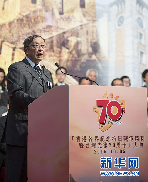 2015年10月5日,东京审判中国检察官向哲濬之子、上海交通大学东京审判研究中心名誉主任向隆万在香港会议展览中心举行的香港各界纪念抗日战争胜利暨台湾光复70周年大会上致辞。新华社记者 吕小炜 摄