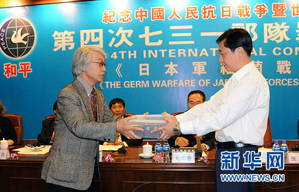 2008年9月18日,在哈尔滨举行的第四次731部队罪行国际学术研讨会上,日军侵华战争历史学者森正孝(前左)向哈尔滨市社会科学院代表捐赠自己近30年来对731问题调查采访的珍贵资料。新华社记者 徐宜军 摄