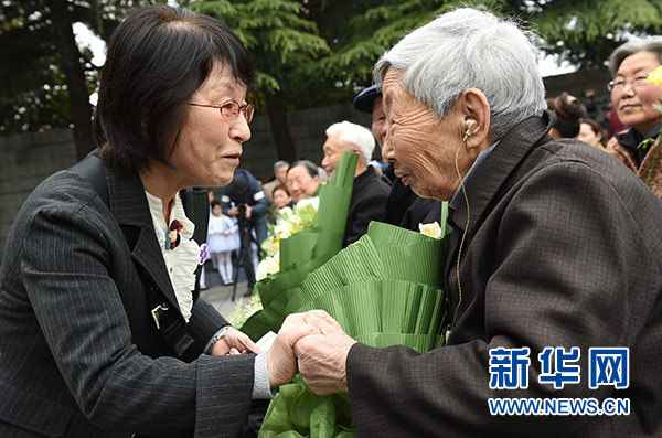 2016年4月4日,南京大屠杀历史学者松冈环(左)在南京参加祭奠活动时与南京大屠杀幸存者杨翠英交流。新华社记者 韩瑜庆 摄
