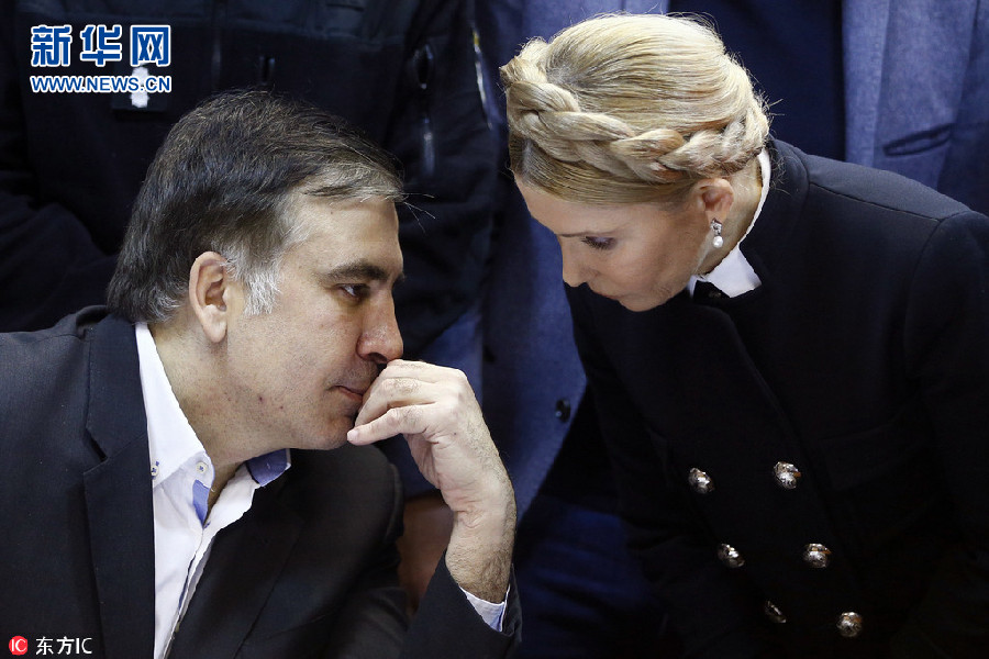 当地时间11日,乌克兰基辅,格鲁吉亚前总统、乌克兰敖德萨州前州长萨卡什维利出庭受审,乌克兰前总理季莫申科出席。(图片来源:东方IC)