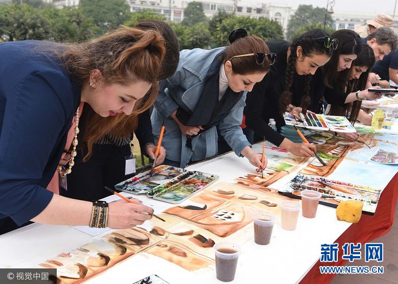 当地时间2017年12月11日,印度新德里,艺术家绘制关于德里景点的75米长水墨画卷,挑战世界纪录。(图片来源:视觉中国)