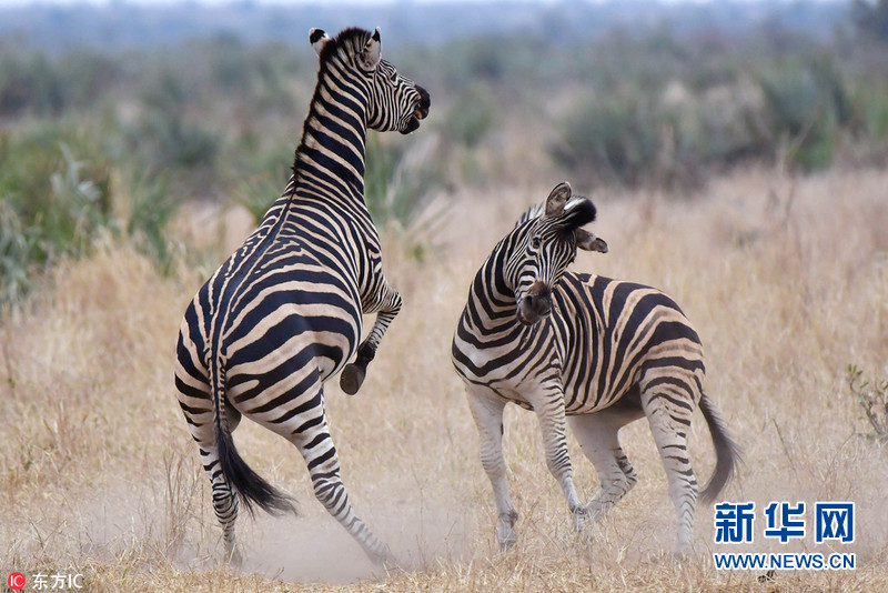南非克鲁格国家公园,一群斑马正在一个水坑处饮水,其中两头斑马突然“一言不合”干起了架。它们互相追逐、撕咬对方,用腿踢打对方,战斗场面十分激烈。摄影师Bernhard Bekker表示整个战斗持续了约15分钟。图片来源:东方IC