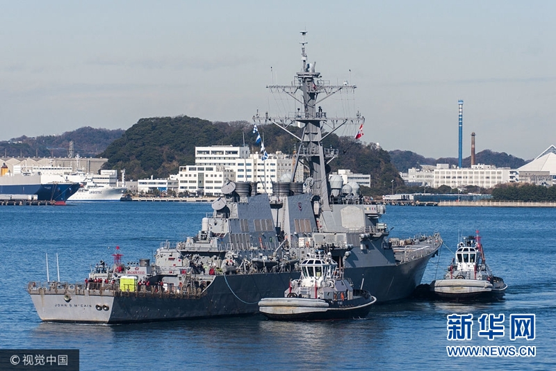 当地时间2017年12月13日,日本横须贺,美国“麦凯恩”号导弹驱逐舰抵达横须贺港准备进行维修。2017年8月,“麦凯恩”号在新加坡附近海域与一艘商船相撞遭受重创,有10名舰员因此死亡。(图片来源:视觉中国)