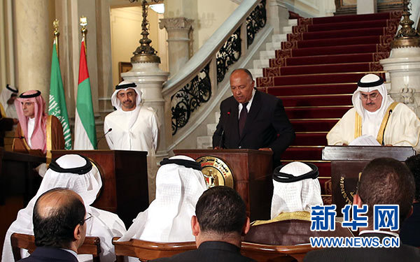 2017年7月5日,在埃及首都开罗,埃及外长舒凯里(后右二)在四国外长会后的联合记者会上宣读联合声明。联合声明称,卡塔尔对四国提出的13点要求的回复不能令人满意。巴林、沙特阿拉伯、阿拉伯联合酋长国、埃及6月5日分别宣布与卡塔尔断绝外交关系,指责卡塔尔支持恐怖主义活动并破坏地区安全局势。新华社发